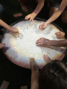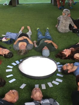 Finding the pearl inside was an action seance planned in St. Elisabeth church in Kassel. The audience was composed of the artists participating during Overlapping Kassel. They were not told beforehand what was expecting them. The artist Birthe Blauth transformed the inside of the catholic church into an imagined paradise with green grass on the floor and a chalice with pearls in the center of it. By organizing the seance in an already designed space, which was open free of charge to all visitors, I realized that I was being made a favor. The participants were from the beginning completely immersed in the space as we arrived during a acoustic concert.
